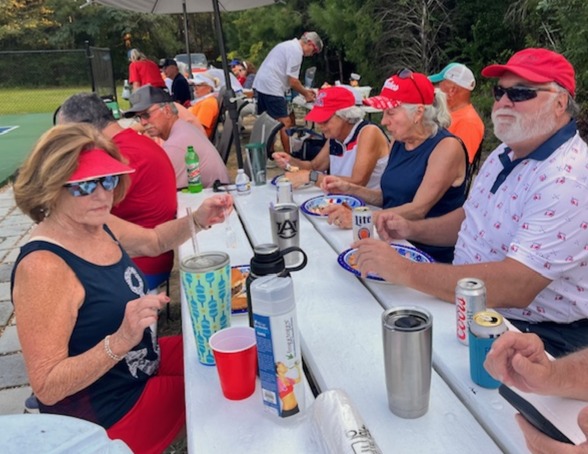 Close to 30 members of the ECC Court Sports Association gathered on September 4th for a US Open Event. This group plans events around all four of the tennis majors. The US Open is always around Labor Day weekend and is the final major of the year. Tennis players played tennis, while pickleballers played their game and all enjoyed burgers and hot dogs prepared by Chef Mark Campbell, who also organized the event. We appreciate his efforts on our behalf. We appreciate all who participated and we thank Susie Hicks and Kandy Treichel for taking pictures of the event.