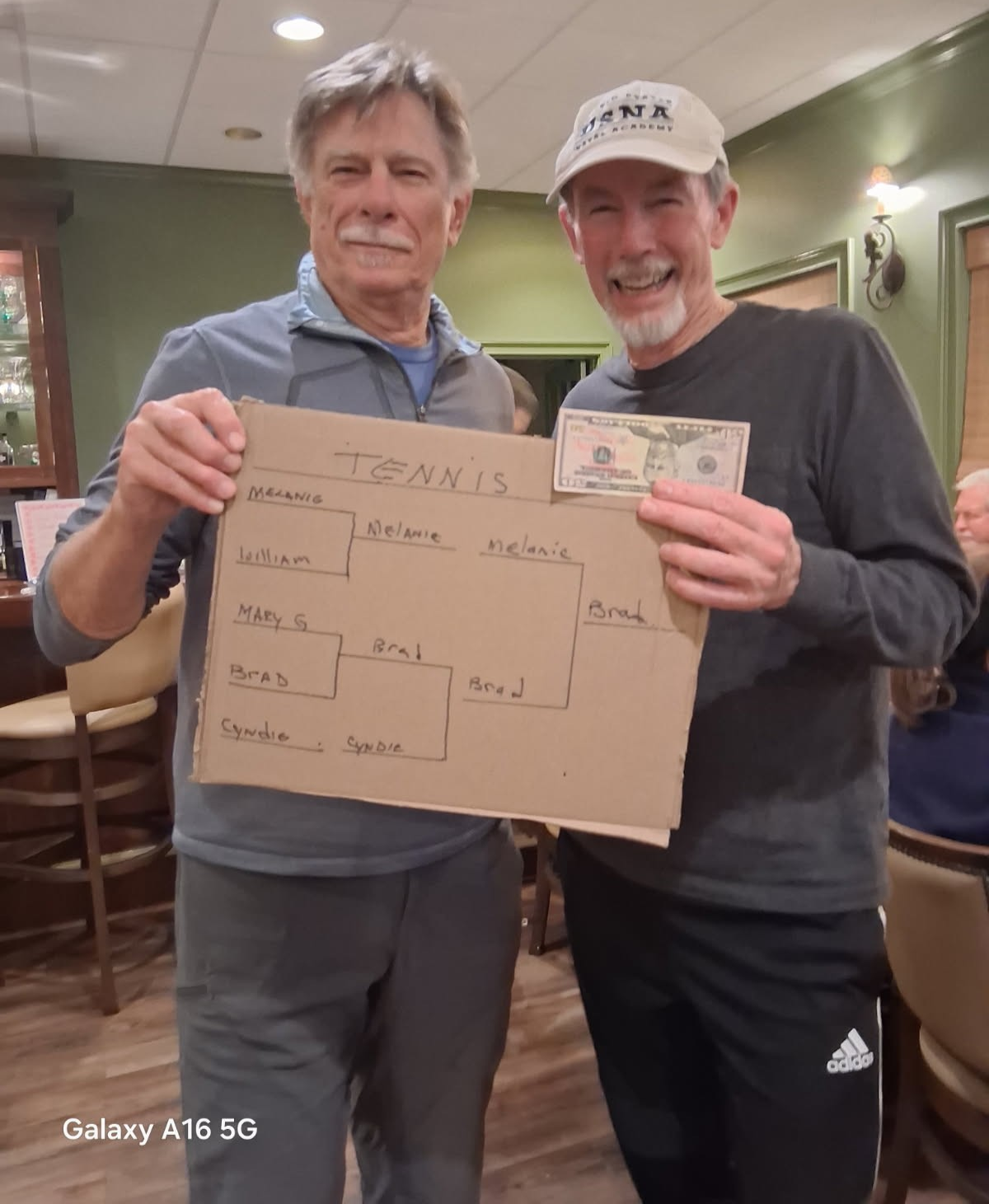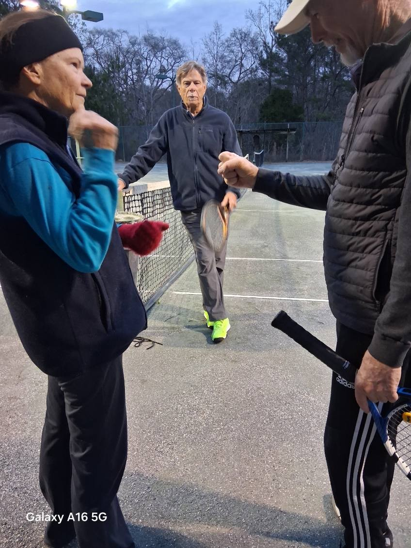 As usual cool temps were around for the 2026 Australian Open Court Sports event. There were 5 tennis players and 5 pickle ballers. President William Treichel thought it was a good idea to copy the real Australian Open's One Point Tournament. He had hoped for more participation, but decided to go with the numbers that braved the cold temps. The brackets were determined by blind draw and the servers were determined by playing Rock, Paper, Scissors. Brad Moore was the winner of the One Point Tennis Tournament and Harry Snead was the winner of the One Point Pickleball Tournament. Seventeen members gathered in the Bar afterwards for a meal of Shrimp on the Barbi, sidewinder potatoes, salad and Lamingtons for dessert. We thank William for organizing the event and we appreciate those who braved the cold temps to participate.