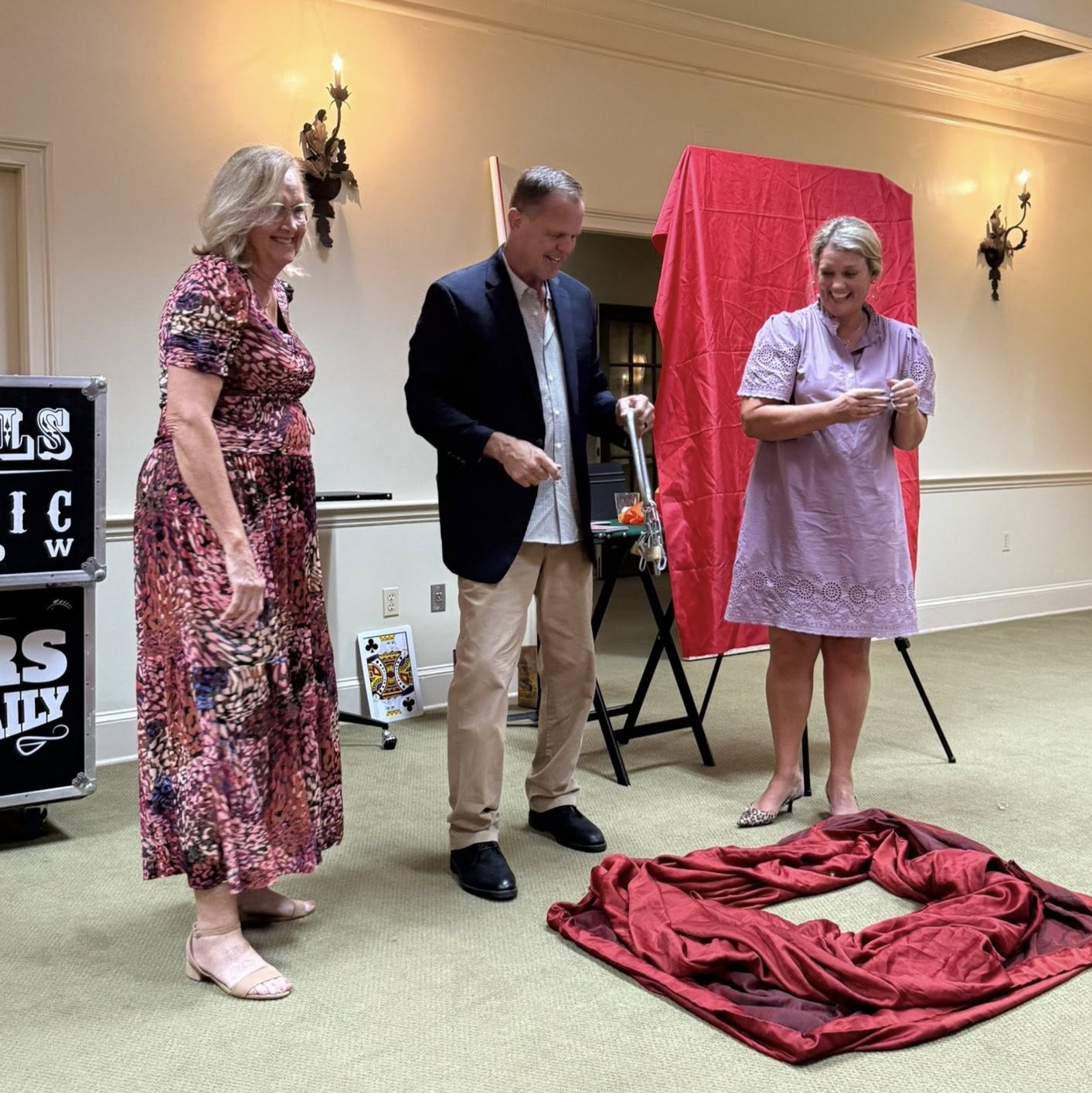 Sandra Richards (Left) and Traci Murph (right) assist Magician Alan Wells (Center)
