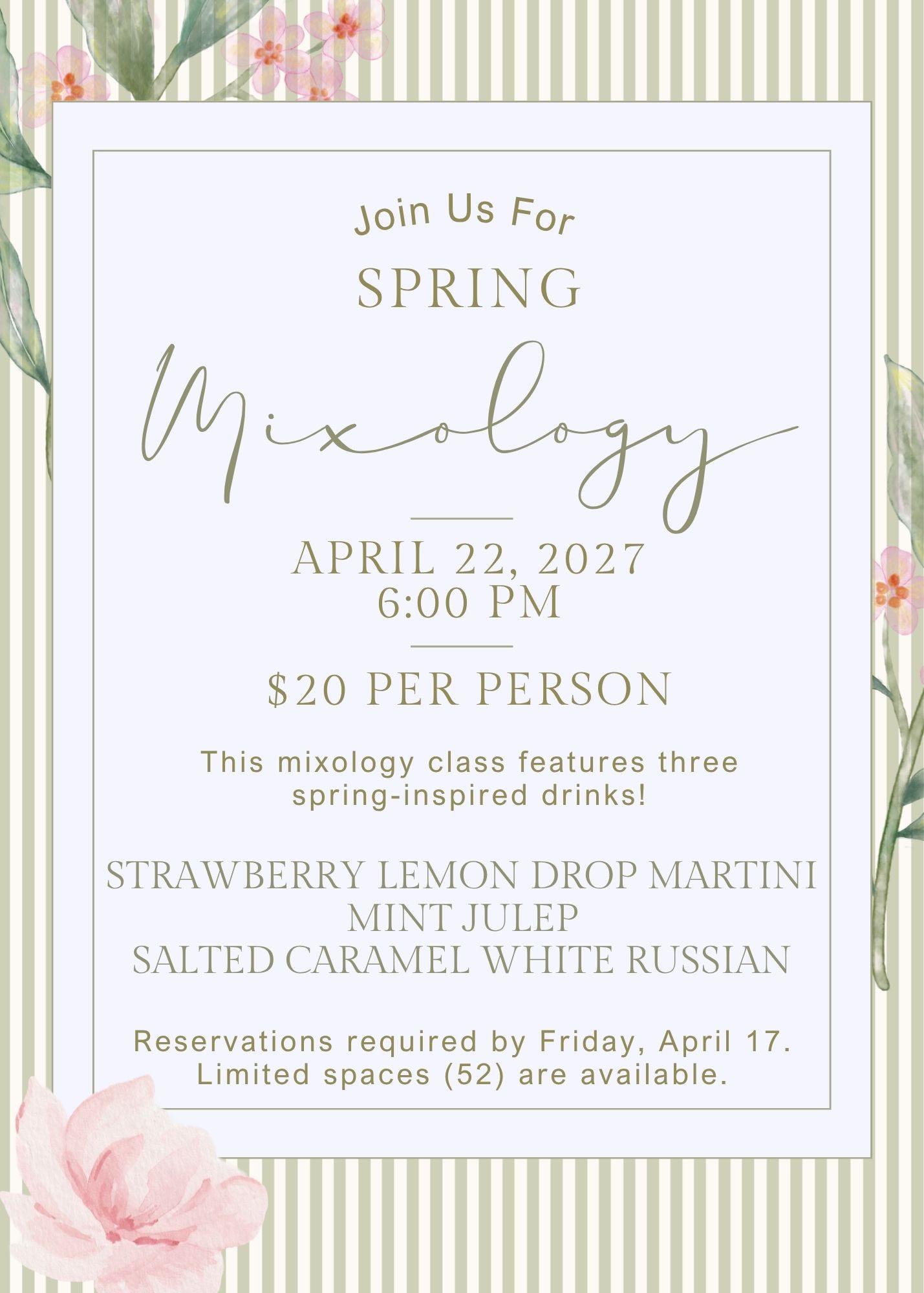 This mixology class features three spring-inspired drinks: Strawberry Lemon Drop Martini, Mint Julep, and Salted Caramel White Russian. Reservations required by Friday, April 17th. Limited spaces (52) are available.6:00pm
