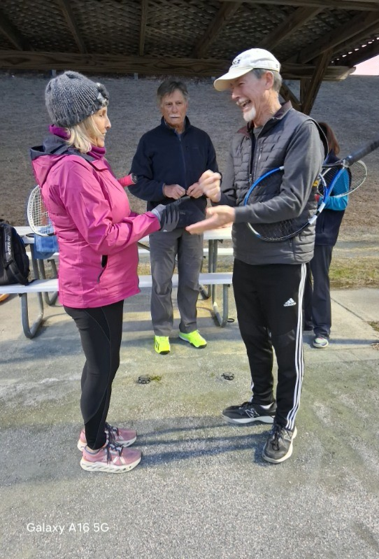 As usual cool temps were around for the 2026 Australian Open Court Sports event. There were 5 tennis players and 5 pickle ballers. President William Treichel thought it was a good idea to copy the real Australian Open's One Point Tournament. He had hoped for more participation, but decided to go with the numbers that braved the cold temps. The brackets were determined by blind draw and the servers were determined by playing Rock, Paper, Scissors. Brad Moore was the winner of the One Point Tennis Tournament and Harry Snead was the winner of the One Point Pickleball Tournament. Seventeen members gathered in the Bar afterwards for a meal of Shrimp on the Barbi, sidewinder potatoes, salad and Lamingtons for dessert. We thank William for organizing the event and we appreciate those who braved the cold temps to participate.