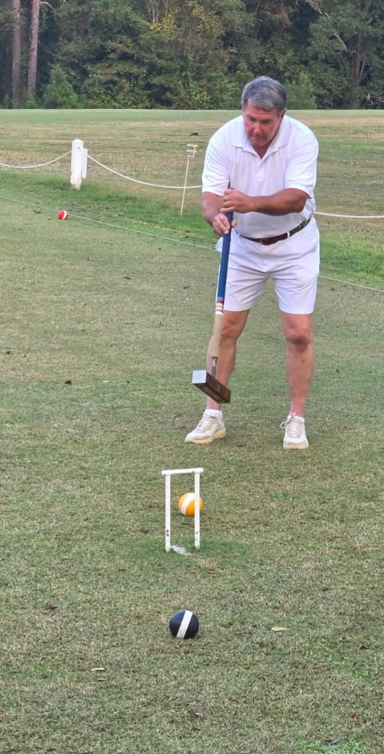 Two-Time Club Croquet Champion Leckie Mattox relaxes during rain delay.